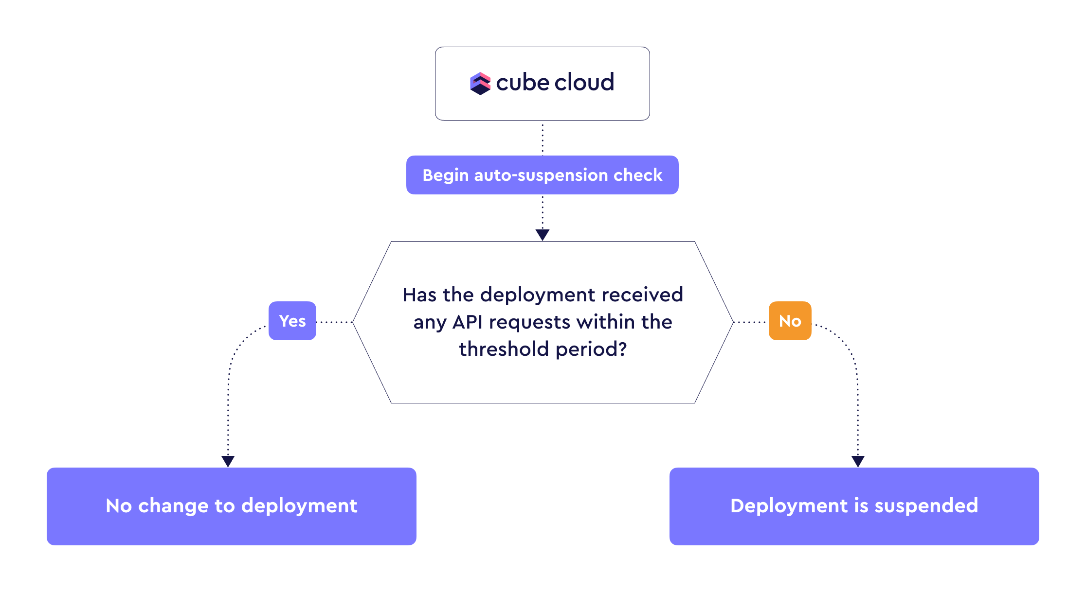 If auto-suspension is enabled, the behavior of your Cube Cloud deployment will experience some notable changes. When a deployment is auto-suspended:- Data model compilation artifacts are discarded since the API instances are de-provisioned.